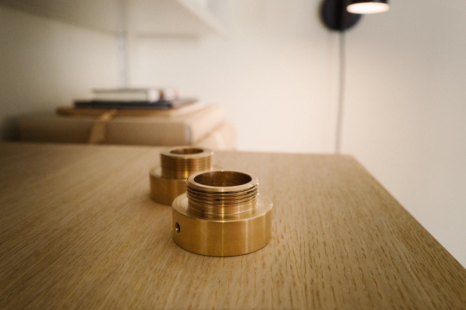 Similar in design to the cast armboard offered by Auditorium 23, this version differs in several regards. First is the positioning of the asymmetric mounting point which allows me to gain more clearance from an intruding rear wall. Second is a series of three interchangeable mounting collars attached via a machined thread to accommodate various arm pillars in a single setup. These are sized for a Thomas Schick arm, an EMT 997 / Ortofon 309 and a Fidelity Research (and presumably quite a few other arms not in my possession).