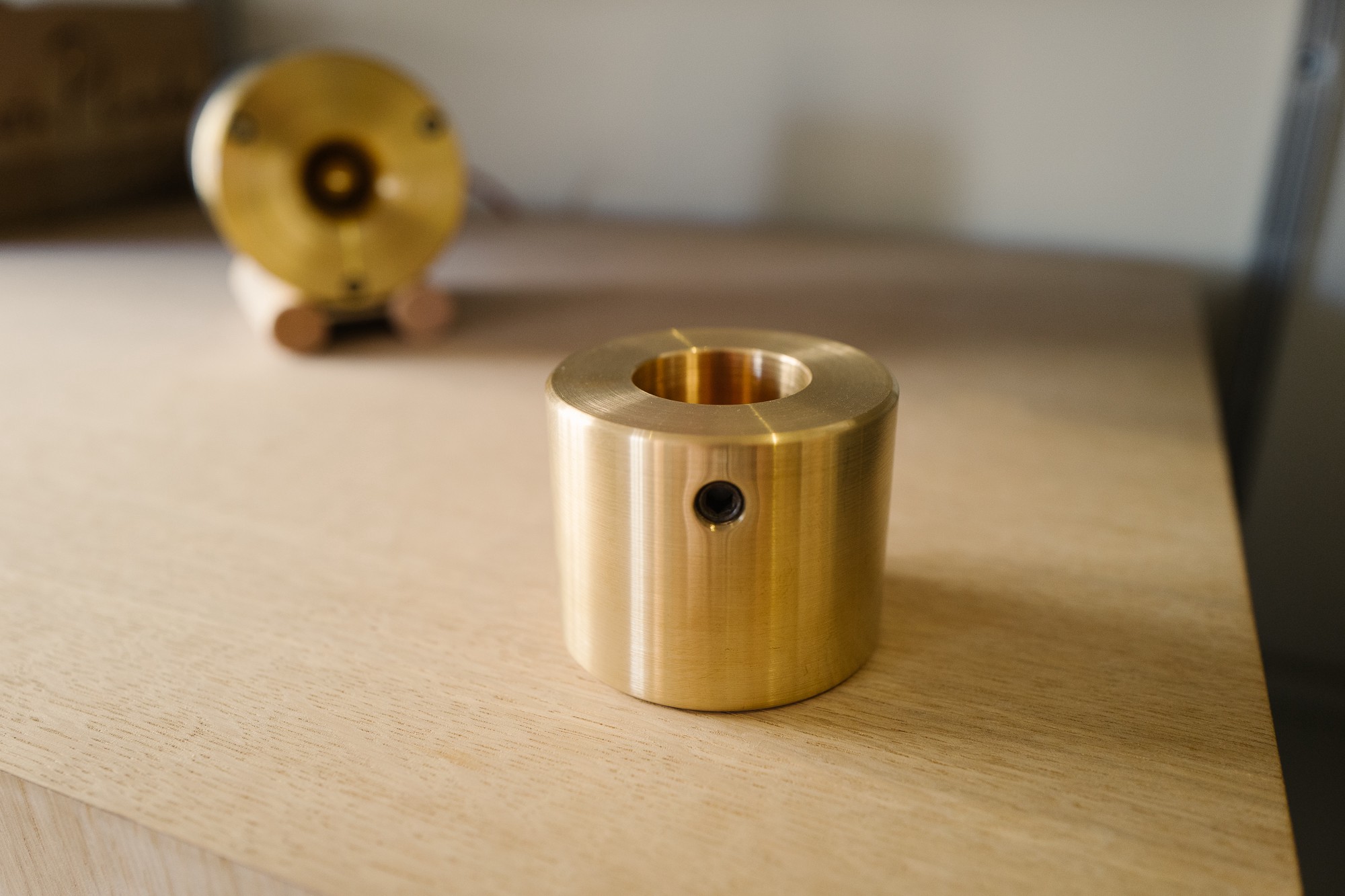 First up was the most substantive addition of the bunch — a precisely lathed and balanced bronze platter coupled with a companion bearing of appropriately gargantuan size. Unlike the original 6 pound cast platter this golden hued addition weighs in at startling 13.5kg (30lbs) or twice the weight of the entire original turntable sans plinth. The platter rides on another beautiful piece of industrial art — a stainless steel bearing of Stefano’s design employing an airgap and mix of grease and oil that spins with a silky precision for minutes after the table is turned off.